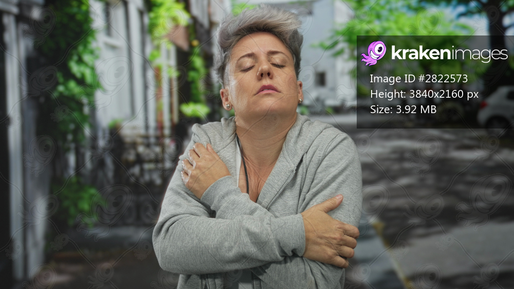Short haired woman coach wearing a whistle clutches chest and presses hand to forehead on a city street; physical exhaustion.