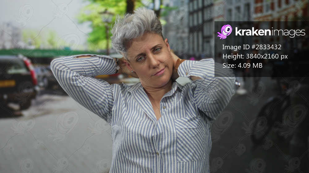 Short haired woman in striped shirt raises arms above head on busy city street; serenity relaxation.