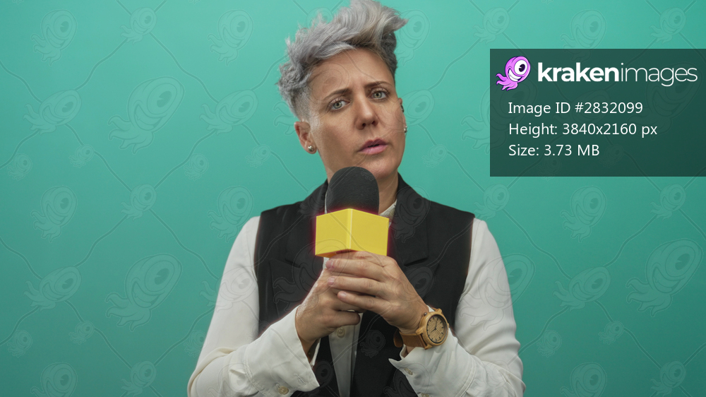Shorthaired caucasian woman wearing white shirt and black vest holds yellow microphone with both hands in studio; contemplation.