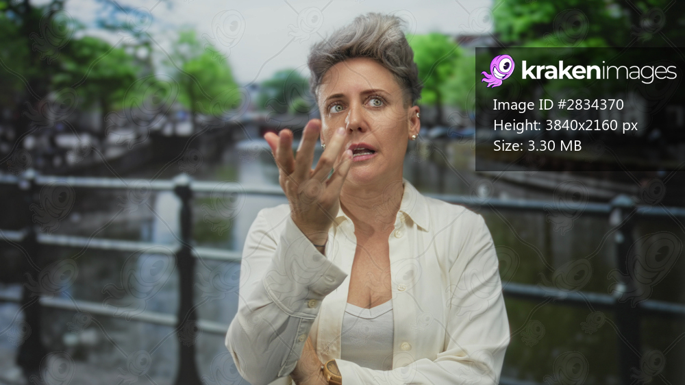 Shorthaired woman in white shirt makes ok sign with raised hand on busy street canal railing; confidence affirmation empowerment positivity.