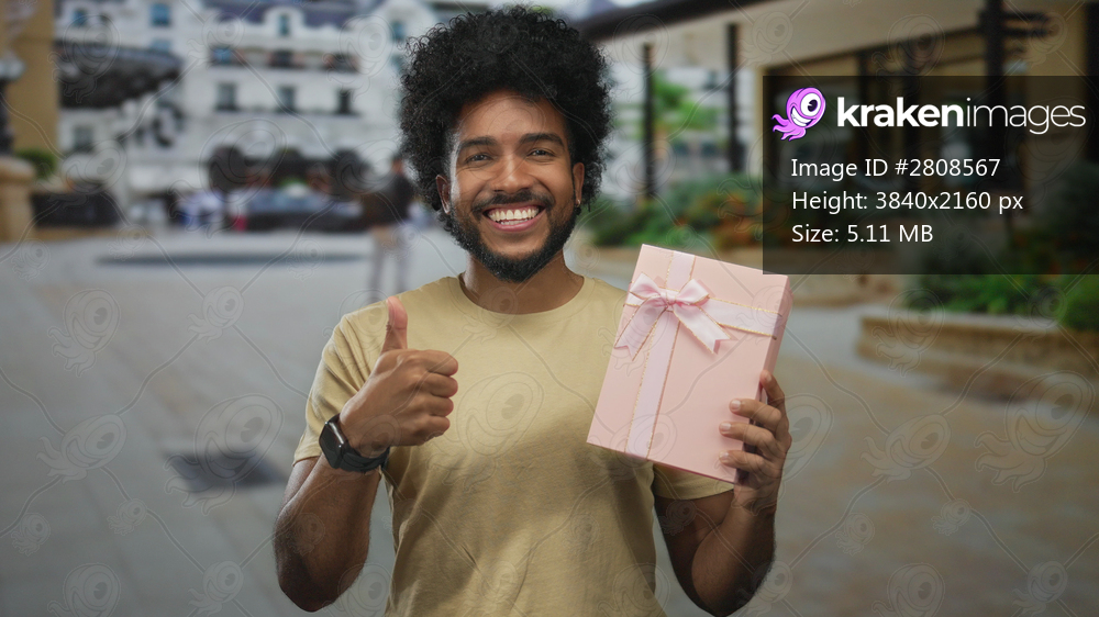 Smiling african american man with curly hair holds pink gift box on urban city street while giving thumbs up in a cheerful outdoor setting.