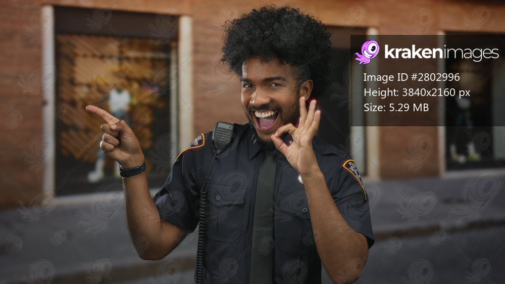 Smiling african american police officer in uniform making an ok gesture on a city street suggesting confidence and friendliness in a busy outdoor urban environment. - Kraken Images
