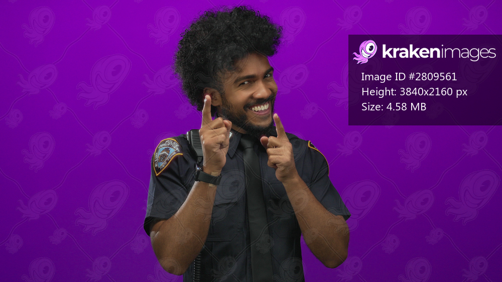 Smiling african american police officer in uniform poses against a vibrant purple wall in an isolated setting, expressing positivity and confidence.