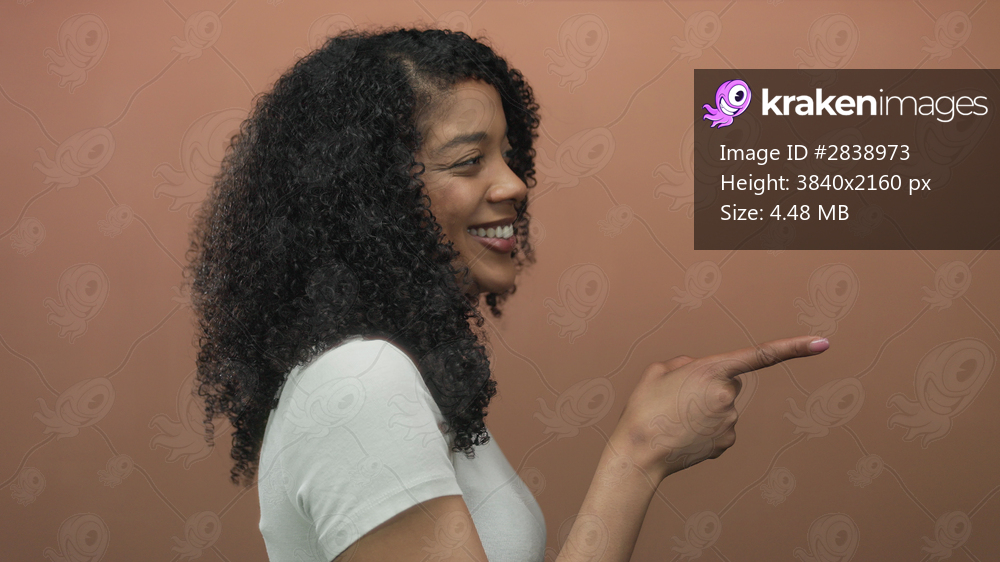 Smiling african american woman with curly hair finger pointing in peach studio wearing white tshirt; highlight joy.