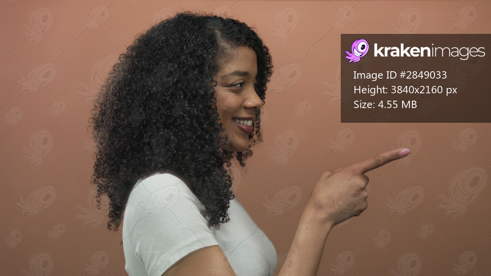 Smiling african american woman with curly hair finger pointing in peach studio wearing white tshirt; highlight joy.