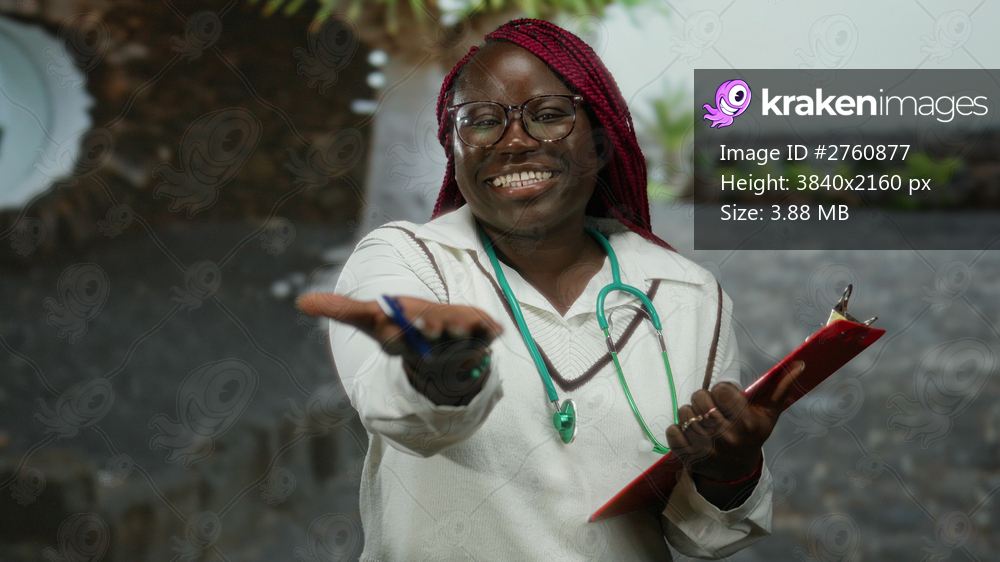Smiling african american woman doctor with outstretched hand holding a clipboard outdoors in an urban setting, suggesting approachability and professionalism. - Kraken Images
