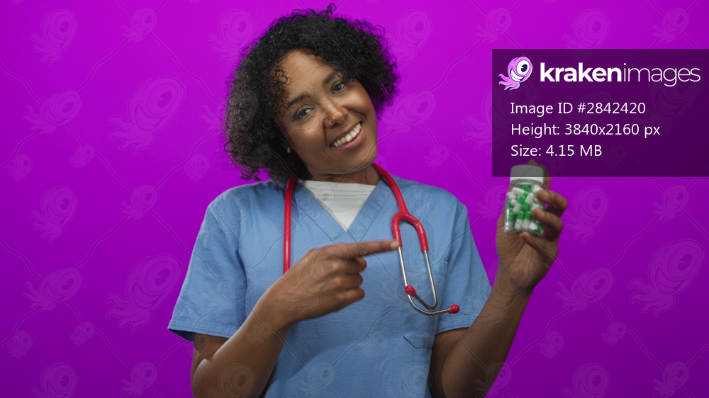 Smiling african american woman doctor points finger to pill bottle while wearing stethoscope against purple studio wall; care.