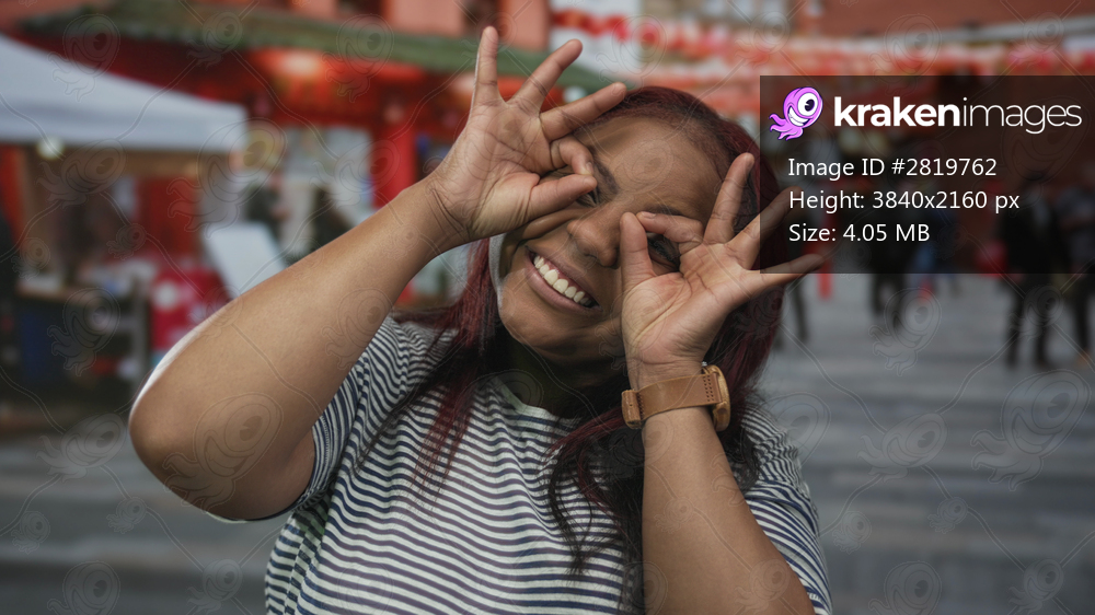 Smiling african american woman makes hand binoculars over eyes on city street; playfulness and curiosity.