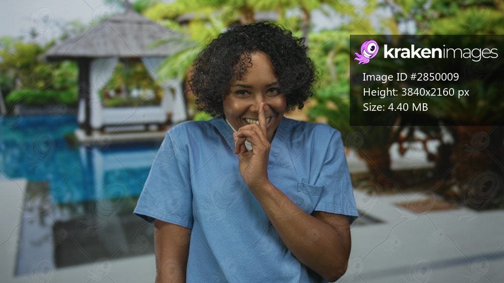 Smiling african american woman touches finger to lips for silence inside hotel building with pool visible; quiet moment.
