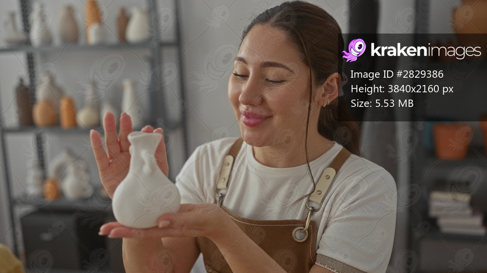 Smiling artisan woman holds and inspects white ceramic vase with both hands in bright studio; creativity.