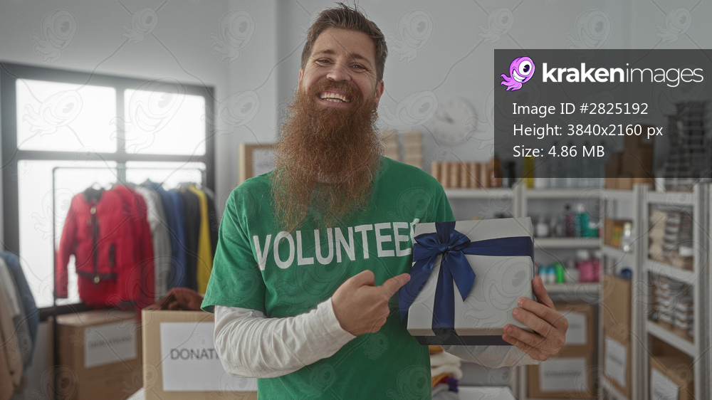Smiling bearded man points finger to wrapped gift box on shelves in building; compassion community service giving.