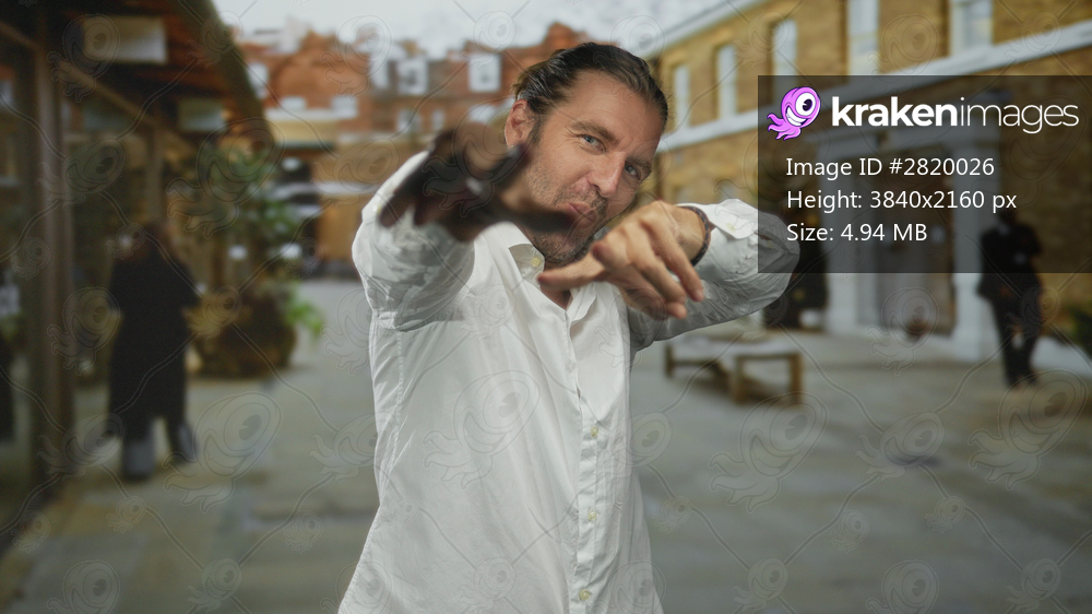 Smiling blond man with long hair tied back points finger to camera on sunlit street in casual white shirt; confidence.