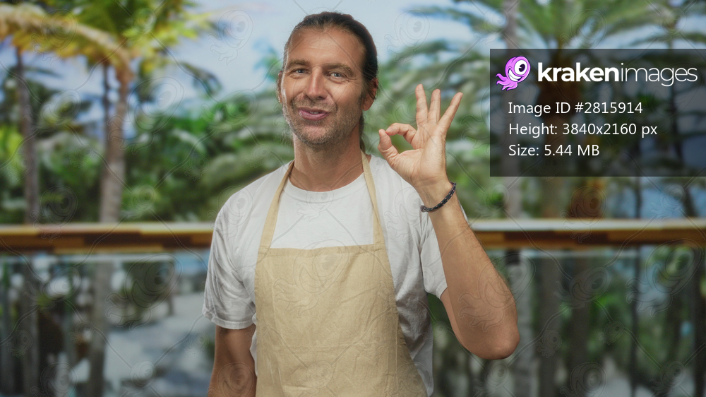 Smiling blond man wearing beige apron makes ok hand gesture in luxury hotel building; optimism hospitality welcome.
