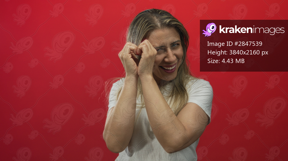 Smiling blonde middle aged woman wearing white shirt forms heart shape with hands in red studio; love affection.