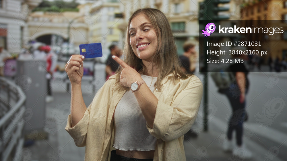 Smiling blonde woman with friendly grin wearing wristwatch points finger to creditcard on busy city street; empowerment confidence.