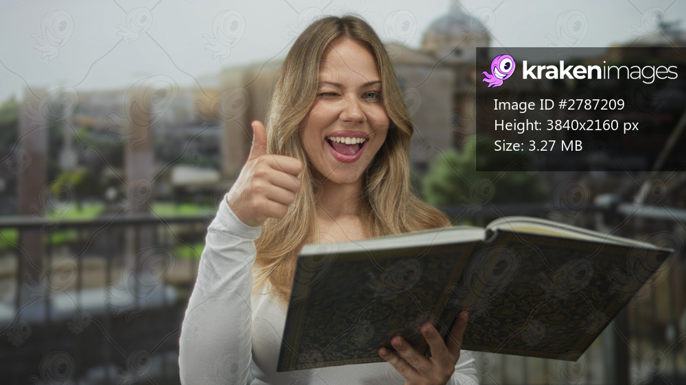 Smiling blonde woman holding open book winks on roman street; approval encouragement confidence joy.