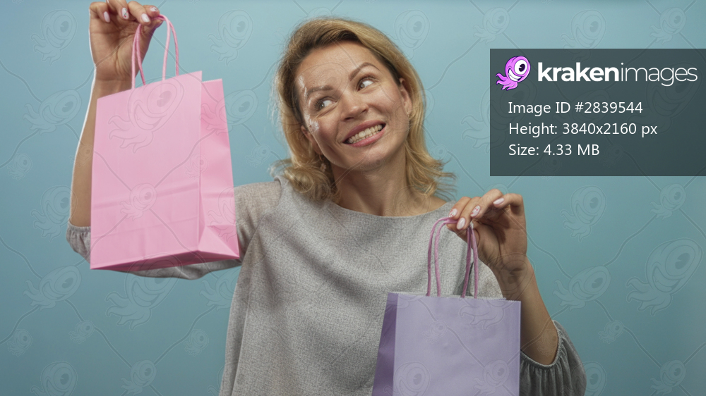 Smiling blonde woman holding pink and purple shopping bags in studio; shopping excitement and satisfaction.