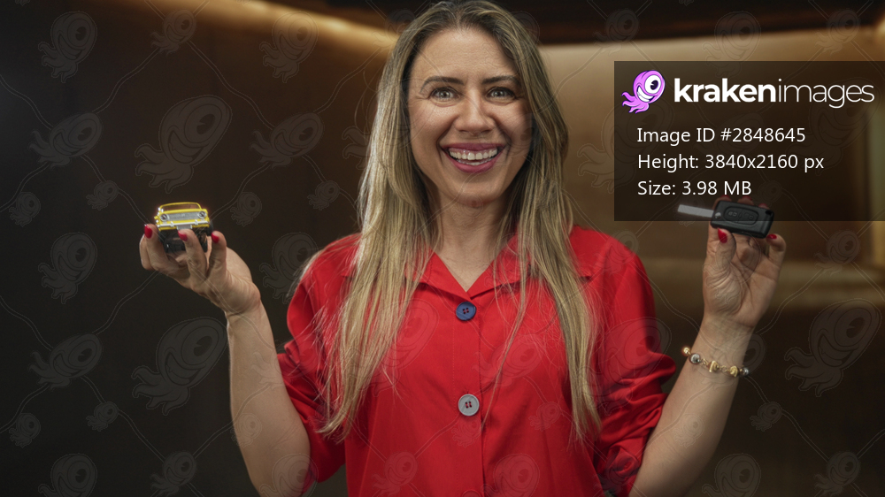 Smiling blonde woman holds toy car and a car key in a studio setting with warm lighting and red shirt highlights; joy.