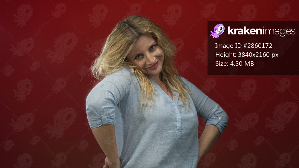 Smiling blonde woman in blue shirt with hands on hips in studio red backdrop, casual pose; playful confidence.