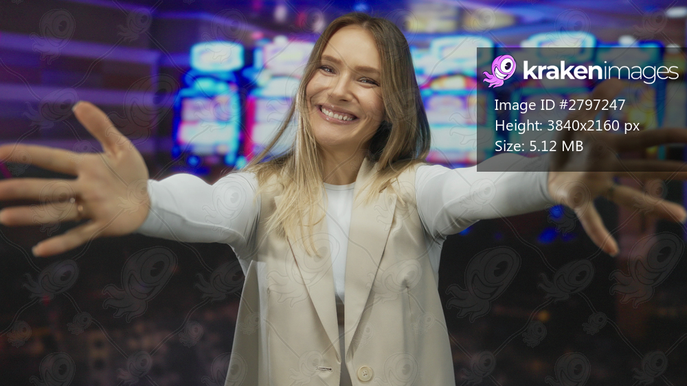 Smiling blonde woman in casino embraces herself joyfully near slot machines under vibrant lights, showcasing a happy gaming atmosphere indoors.