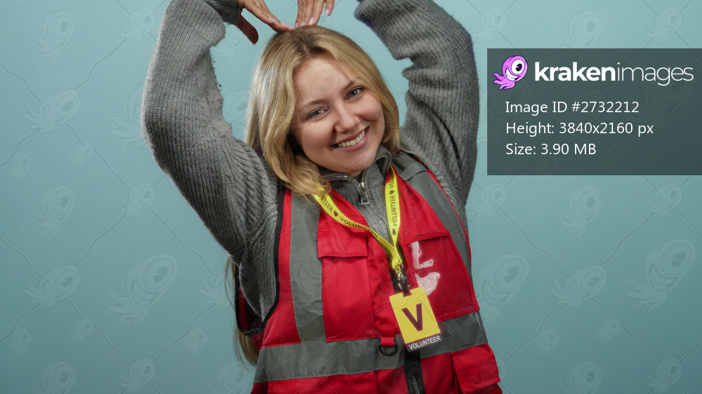 Smiling blonde woman in red volunteer vest makes heart symbol with hands against blue wall background.