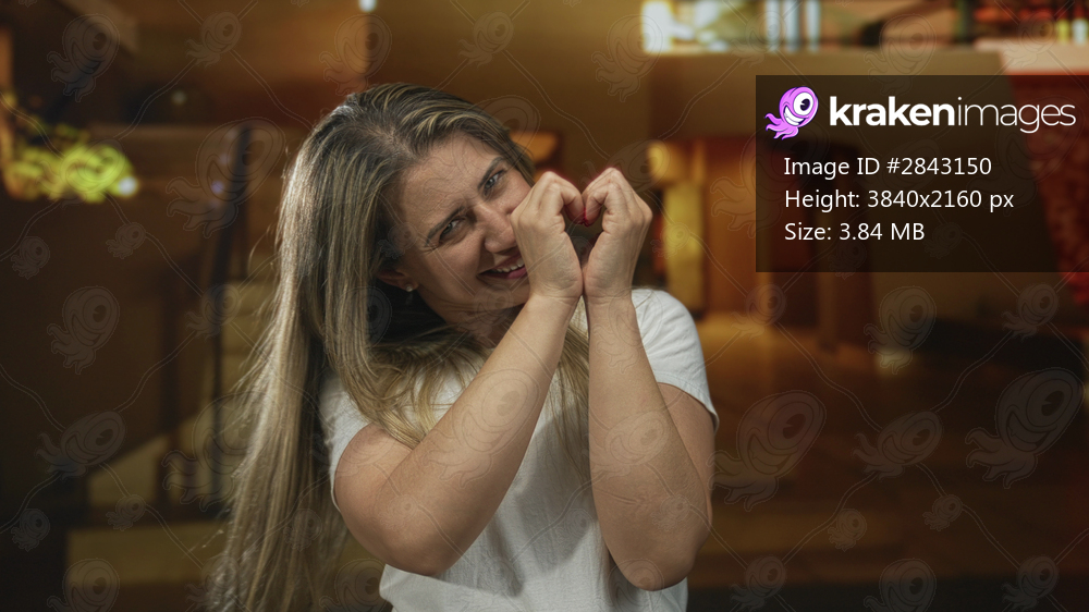Smiling blonde woman making heart shape gesture with hands in bright building lobby; love and connection.