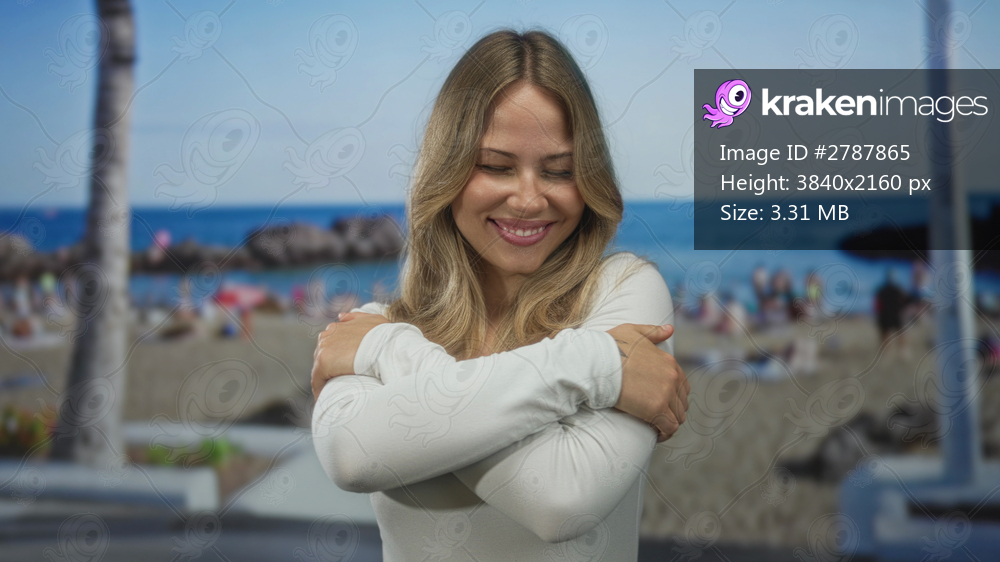 Smiling blonde woman with open smile hugs her bare arms on sunny beach promenade; self love confidence joy.