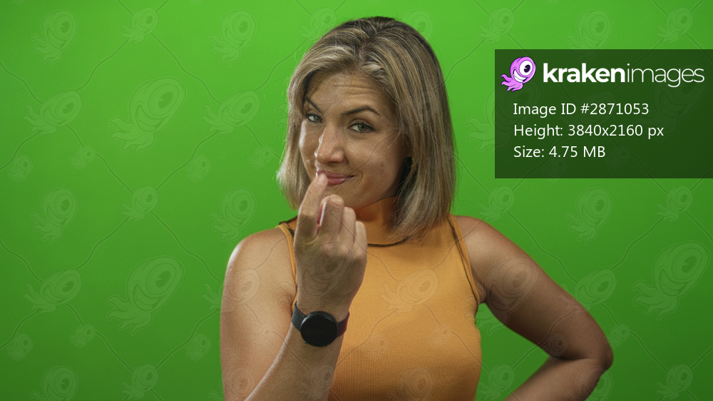 Smiling blonde woman wearing an orange sleeveless top beckons with bare hand in a bright green studio session; confidence.