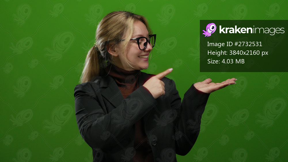 Smiling blonde woman wearing glasses and black blazer points to empty space against vibrant green isolated background showcasing empty concept gesture confidence and presentation - Kraken Images