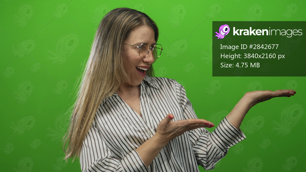 Smiling blonde woman wearing glasses gestures with open hands in studio green screen; surprise wonder.