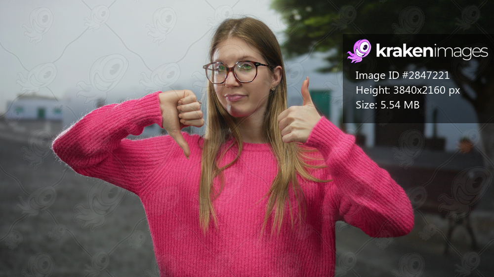 Smiling blonde woman wearing pink sweater gives thumbs up and thumbs down gesture in sunny street; indecision.