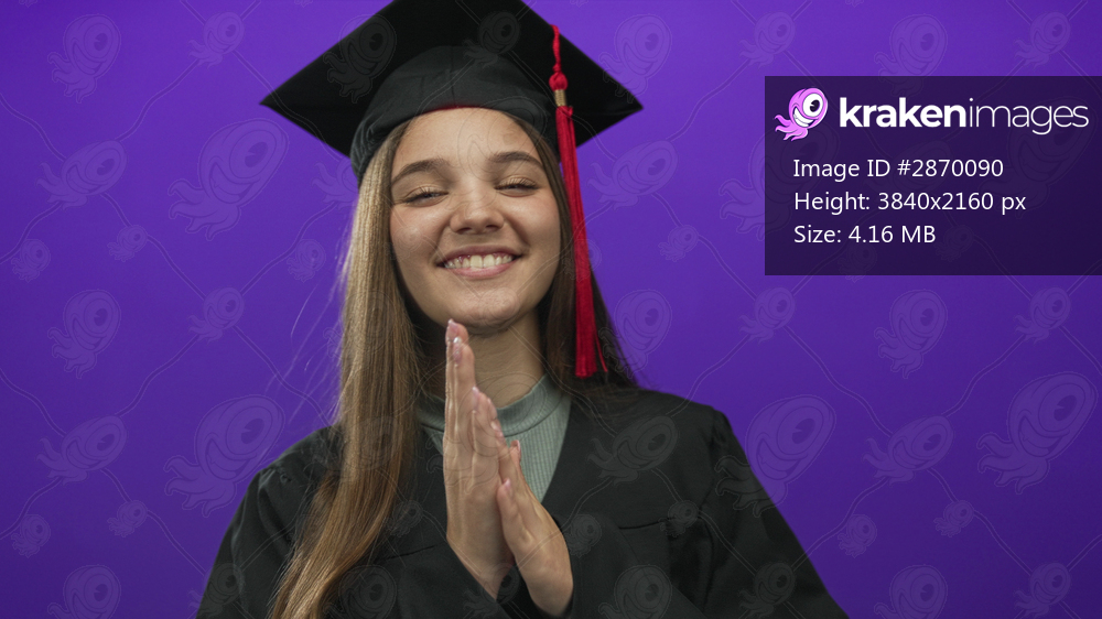 Smiling caucasian teenage girl with long hair and hands pressed together in studio; gratitude hope ambition success.