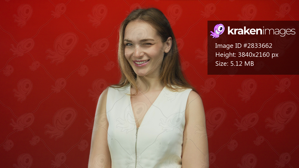 Smiling caucasian woman in white dress beckons with index finger before a red studio wall with direct gaze; welcoming.