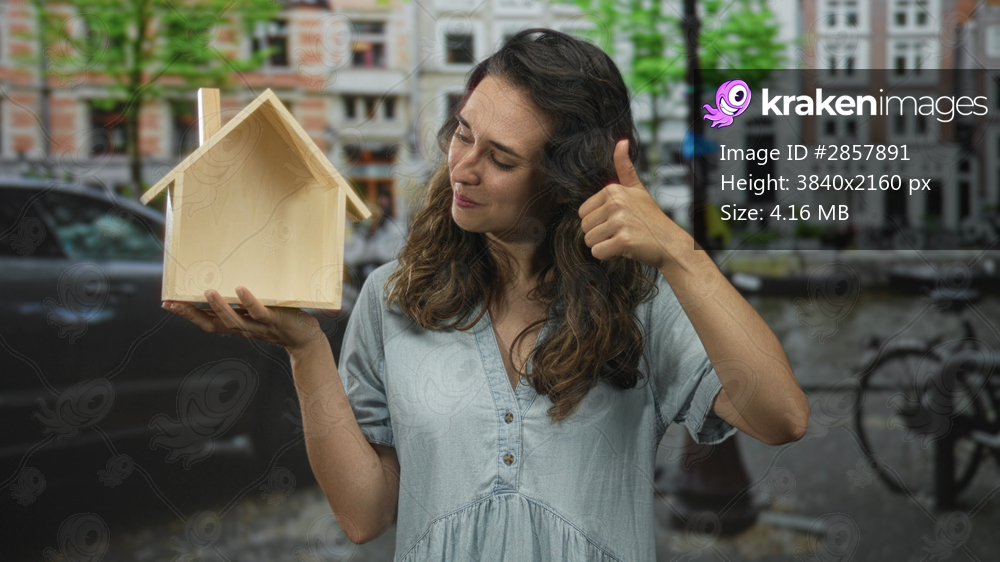 Smiling cheerful young hispanic woman holds small wooden house model and shows thumbs up on street; optimism growth success progress.