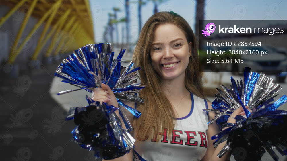 Smiling cheerleader wearing a cheer team uniform with visible letters cheers holding shiny blue pom poms on a street; enthusiasm.