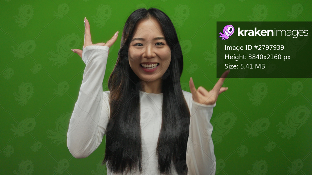 Smiling chinese woman in white shirt makes rock gesture against bright green background wall.
