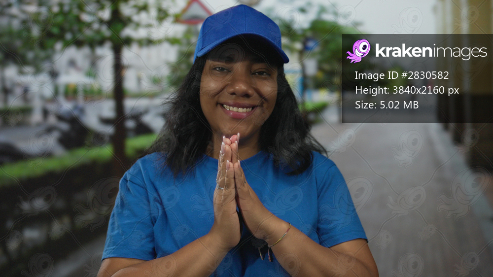 Smiling courier woman in blue cap and shirt presses hands together in greeting on city street; gratitude.