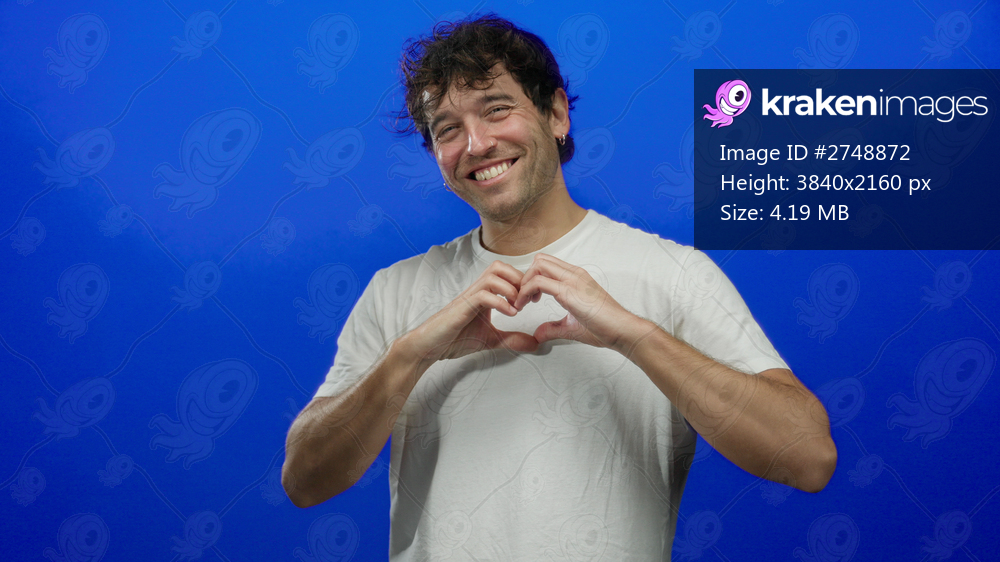 Smiling hispanic man in white shirt against blue background making heart gesture and pointing playfully