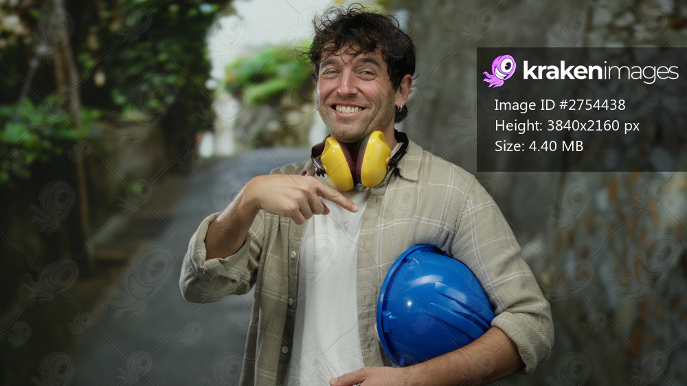 Smiling hispanic man pointing at a blue hardhat, wearing noise canceling headphones, stands in a picturesque mediterranean town alley.