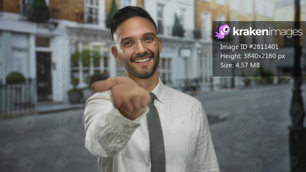 Smiling hispanic man wearing glasses and tie extends hand towards camera standing in a vibrant urban street showcasing a friendly and inviting gesture. - Kraken Images