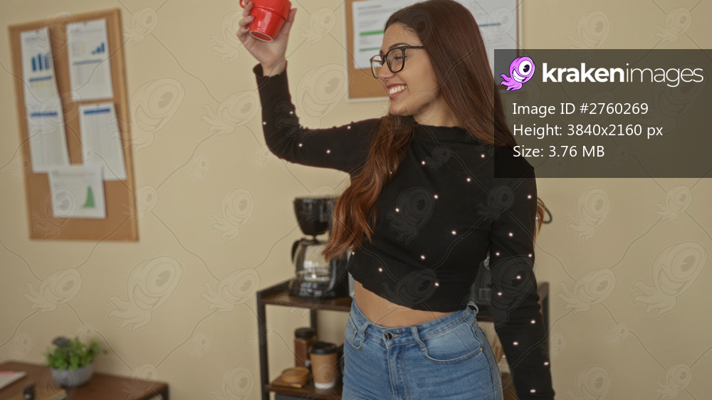 Smiling hispanic woman enjoys dancing at work with a red cup in hand, surrounded by documents and office equipment in a cozy interior setting.