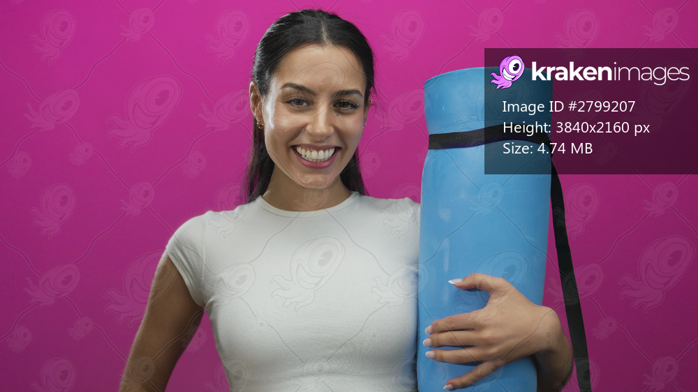Smiling hispanic woman holds a blue yoga mat against a vibrant pink backdrop, capturing a sense of fitness and positivity in a bright, isolated studio setting. - Kraken Images