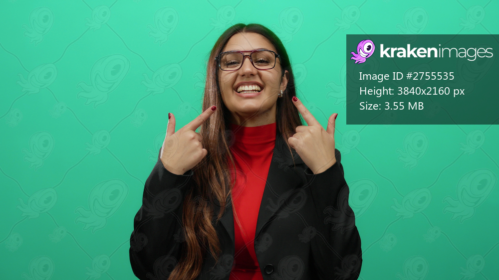 Smiling hispanic woman pointing at herself with both hands, wearing glasses and a black blazer over a red shirt, standing against a green background wall. - Kraken Images