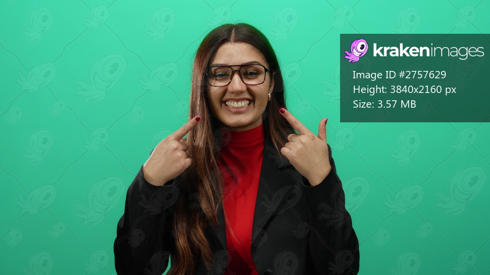 Smiling hispanic woman pointing at herself with both hands, wearing glasses and a black blazer over a red shirt, standing against a green background wall. - Kraken Images