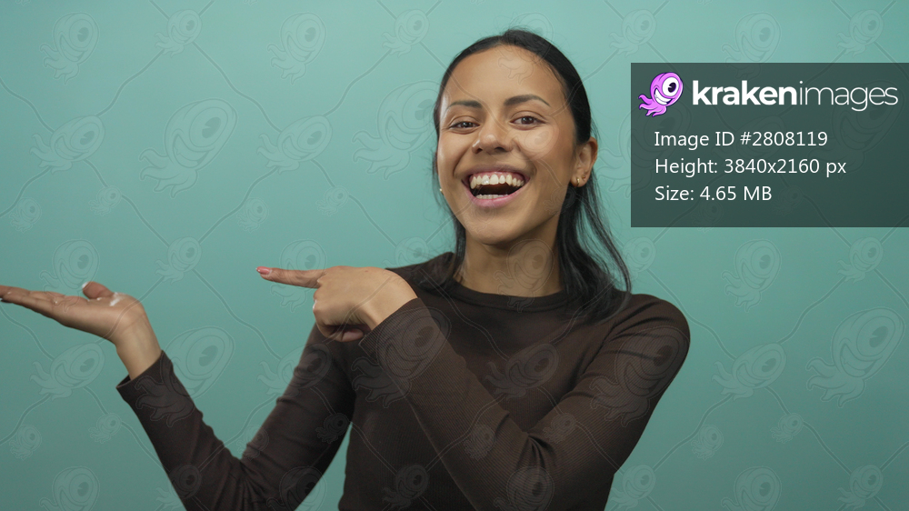 Smiling hispanic woman points to her palm against a green backdrop, exuding confidence and charm with a friendly gesture.