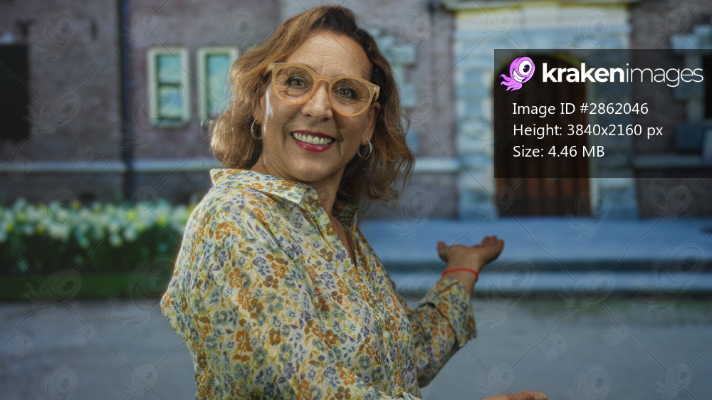 Smiling hispanic woman wearing glasses and floral blouse stands at building entrance with open palms presenting doorway; hospitality.