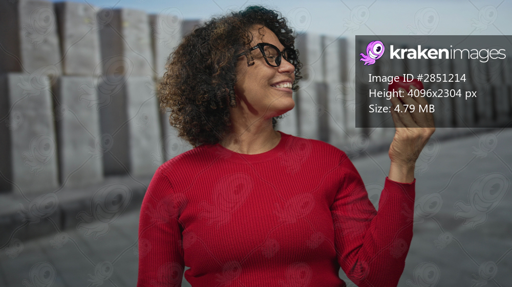 Smiling hispanic woman wearing glasses holds red heart in hand on street in front of concrete wall during daytime; affection.