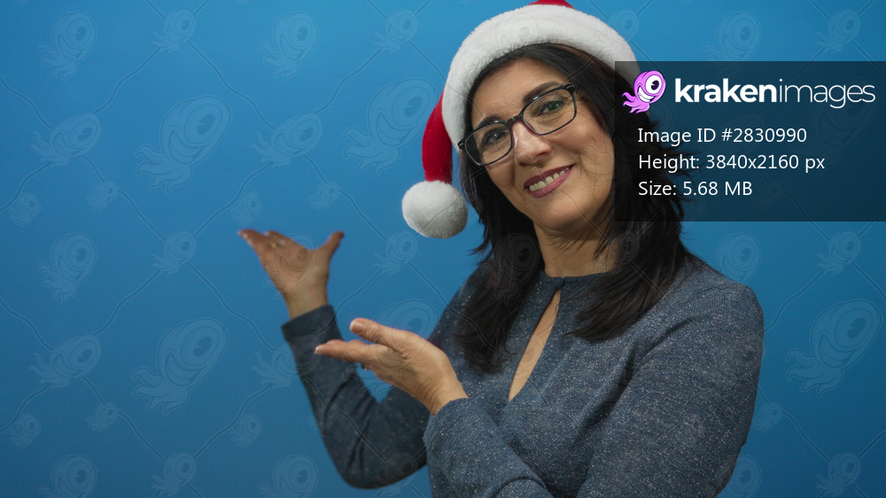 Smiling hispanic woman wearing glasses presents red santa hat with open hands in studio; holiday cheer.
