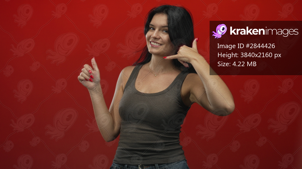 Smiling hispanic young woman makes phone call gesture with painted nails and pointing finger in studio with red background; social connection.