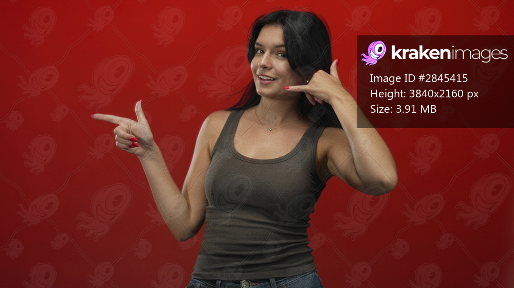 Smiling hispanic young woman makes phone call gesture with painted nails and pointing finger in studio with red background; social connection.